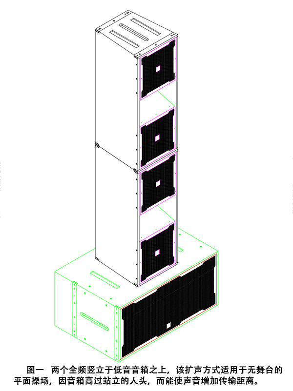 图一,两个全频竖立于低音蜜桃视频插满18在线观看之上,该扩声方式适用于无蜜桃视频APP入口的平面操场,因蜜桃视频插满18在线观看高过站立的人头,而能使声音增加传输距离。
