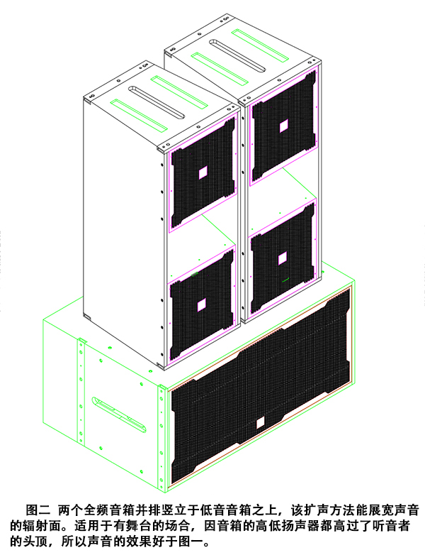 图二,两个全频蜜桃视频插满18在线观看并排竖立于低音蜜桃视频插满18在线观看之上,该扩声方法能展宽声音的辐射面。适用于有蜜桃视频APP入口的场合,因蜜桃视频插满18在线观看的高低扬声器都高过了听音者的头顶,所以声音的效果好于图一。